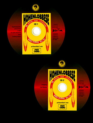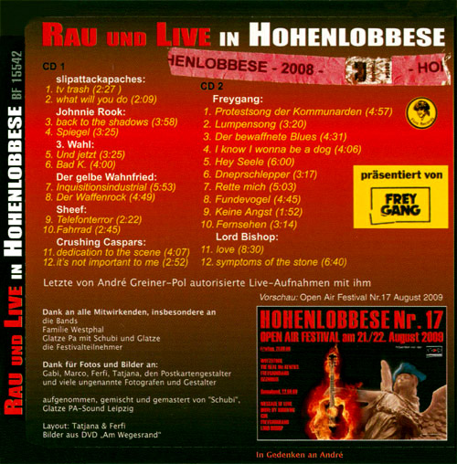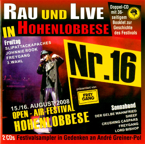 Neue Doppel - CD Rau und Live in Hohenlobbese (2008) In Gedenken an André. ... mit den Bands: slipattackapaches, Johnnie Rook, 3. Wahl, Der gelbe Wahnfried, Sheef, Crushing Caspars, Lord Bishop und Freygang. Rau und Live in Hohenlobbese 15./16.August 2008 Open-Air Festival Nr. 16 - präsentiert von FREYGANG. Doppel-CD mit 36-seitigem Booklet zur Geschichte des Festivals. Erhältlich bei BUSCHFUNK. |