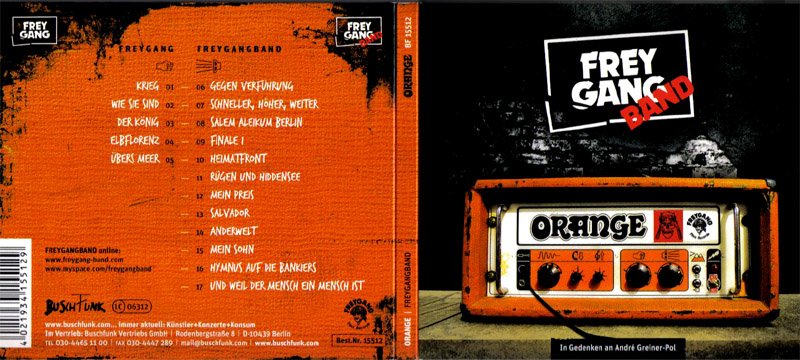 "ORANGE" Am 4.12.2009 erschienen: In Gedenken an André. ORANGE wurde 2008 von André Greiner-Pol mit Freygang im Hip-Gun-Studio begonnen. André verstarb am 15.Dezember 2008. Neun Monate später wurde ORANGE von der Freygangband vollendet. Erhältlich bei den Konzerten und bei BUSCHFUNK. |